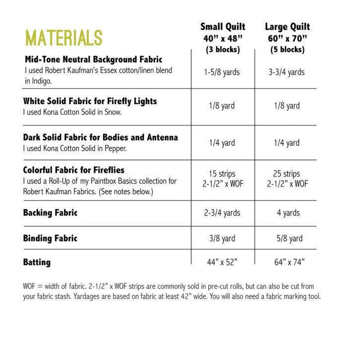 The Frances Firefly quilt pattern includes a much larger version of Elizabeth Hartman’s Frances Firefly character from her Fancy Forest quilt. It uses 2-1/2” fabric strips to create these colorful fireflies. The pattern includes instructions for making quilts measuring 40″ x 48″ or 60″ x 70″.